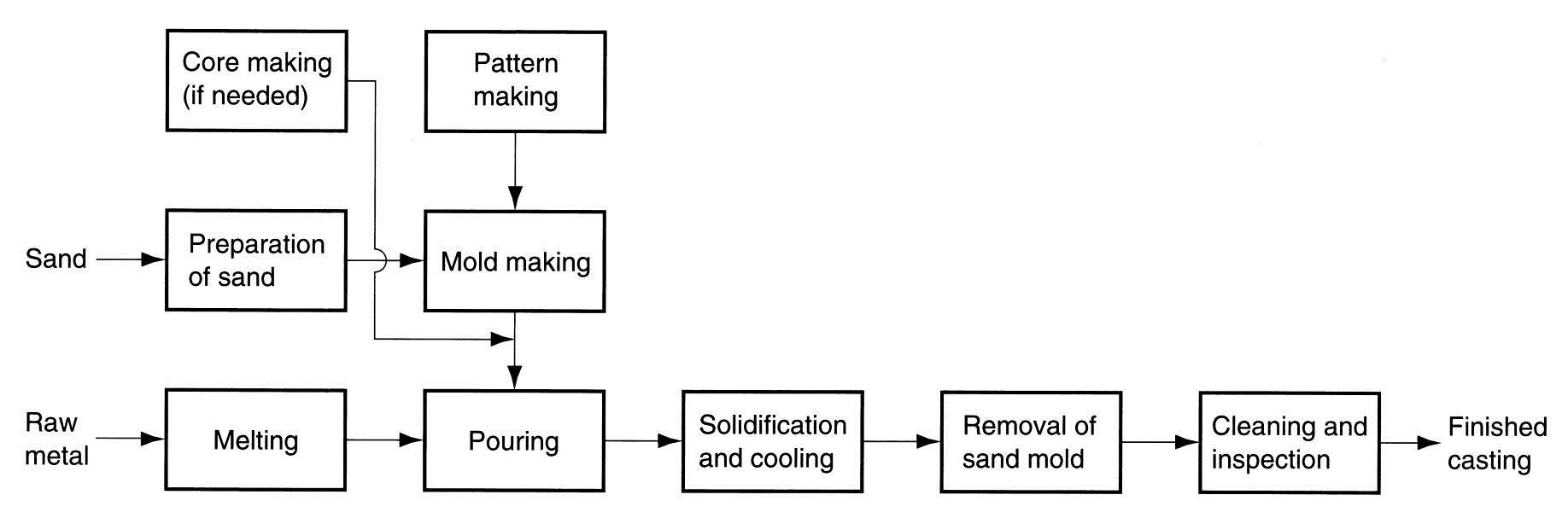 ریخته گری ماسه ای بدلیل همه کاره بودن به یک فرآیند تولید رایج تبدیل شده که شامل مراحل زیر است :