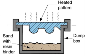 ابتدا هر نیمه ی الگو تا 175 – 370 درجه سانتیگراد حرارت میبیند و با یک روغن ( چرب کننده ) پوشانیده میشود تا خارج شدن آسان گردد . سپس الگوی حرارت داده شده به یک جعبه مرطوب که حاوی یک مخلوط ماسه و چسب رزین است گیر داده می‌شود . جعبه ی مرطوب بر عکس شده تا به مخلوط ماسه – رزین اجازه داده شود که الگو را بپوشاند . الگوی حرارت داده شده مخلوط را بهبود یابد که الان یک پوسته دور الگو شکل داده است . هر نیمه ی الگو و پوسته ی احاطه کننده بهبود یافته تا اتمام در یک کوره و سپس از الگو خارج می‌شود .