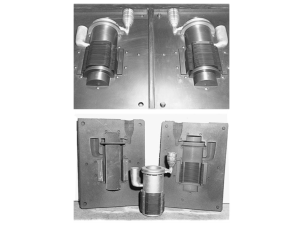 دو پوسته قبل از متصل شدن و قطعه ی نهایی ریخته گری قالب پوسته ای با سیستم راهگاهی و تغذیه متصل به آن