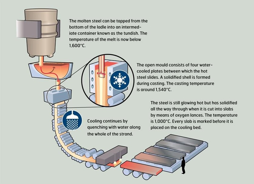 چکیده : یکی از روش های بسیار کاربردی در صنعت فولاد استفاده از ریخته گری پیوسته یا مداوم برای تولید محصولات اولیه مانند شمش، بلیت، بلوم یا اسلب است. به گونه ای که بیش از 95 درصد از تولید فولاد خام جهان در حال حاضر به این روش انجام می شود. این فرایند در واقع متصل کننده خط تولید فولاد و عملیات نورد است.